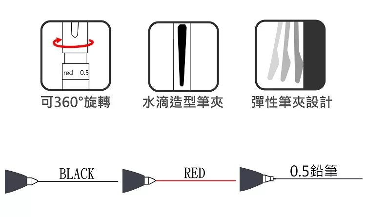 筆夾:水滴狀造型,彈性筆夾設計
