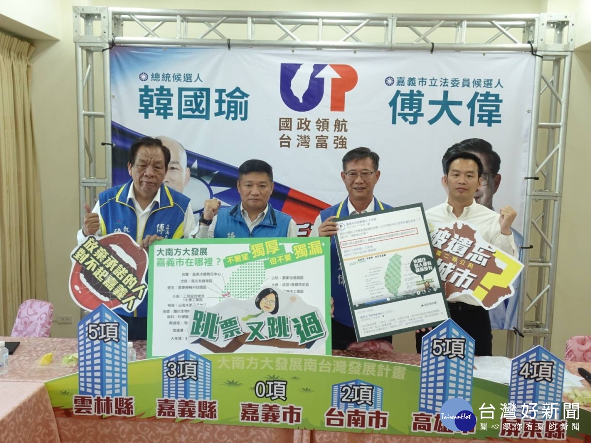 蔡英文總統本月14日提出「大南方計畫案」,預計未來四年投入五千億在濁水溪以南二十二處亮點聚落,聚落分佈雲林縣、高雄市各五項、嘉義縣三項、臺南市兩項,唯獨漏掉嘉義市,嘉義市藍營立委候選人傅大偉批總統「跳票又跳過」,對得起2016年支持蔡總統的嘉義市民嗎?